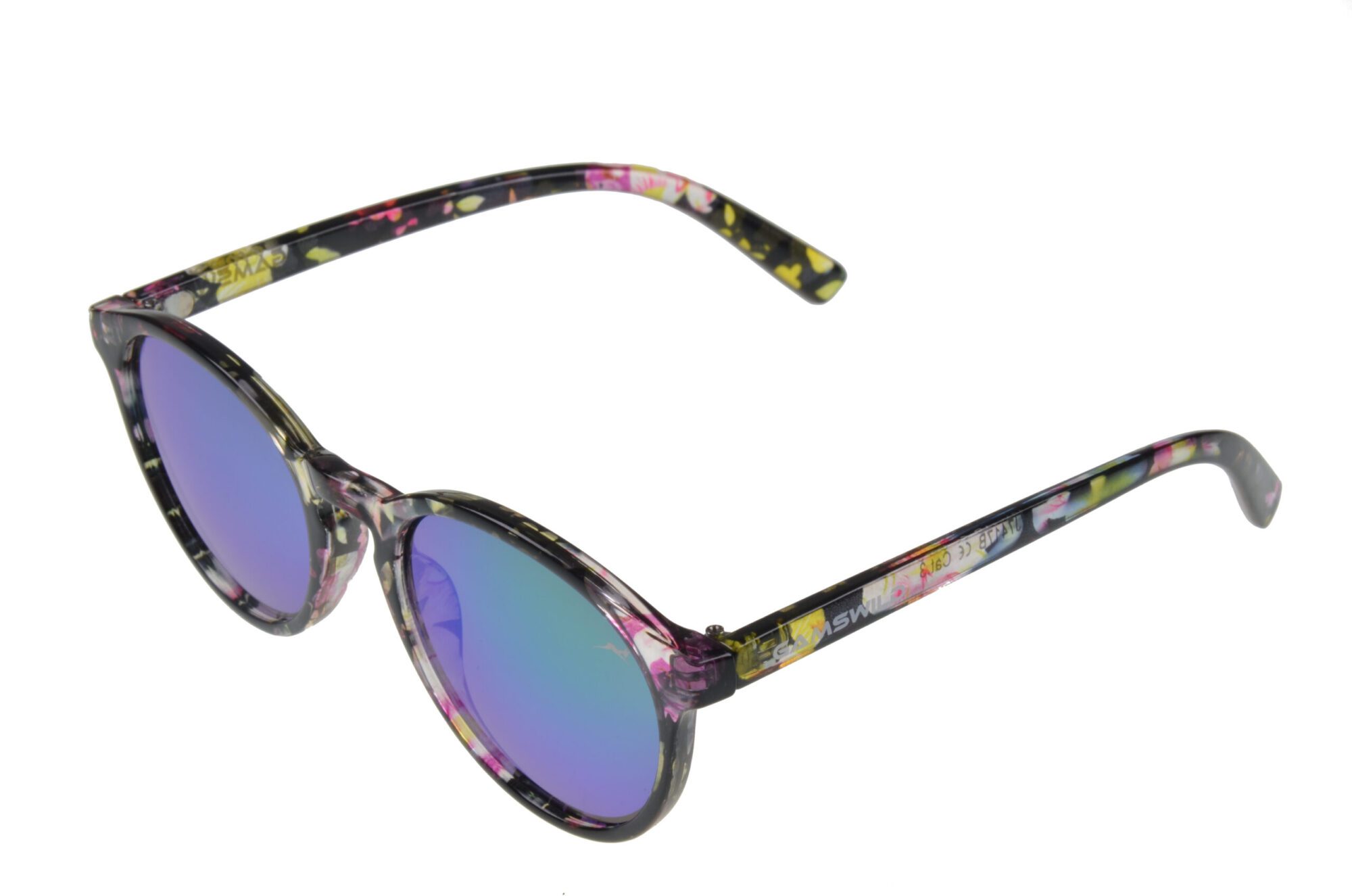 Das Modell “gemustert bunt” besitzt verspiegelte Gläser, das Modell “gemustert lila” getönte Gläser.